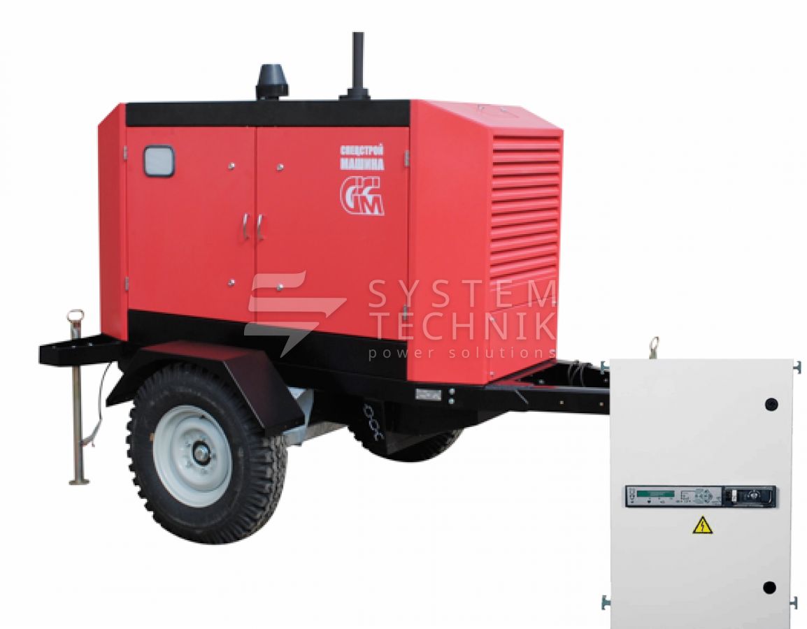 - ССМ ЭД-30-Т400-2РКМ1 в шумозащитном кожухе на шасси с АВР на прицепе