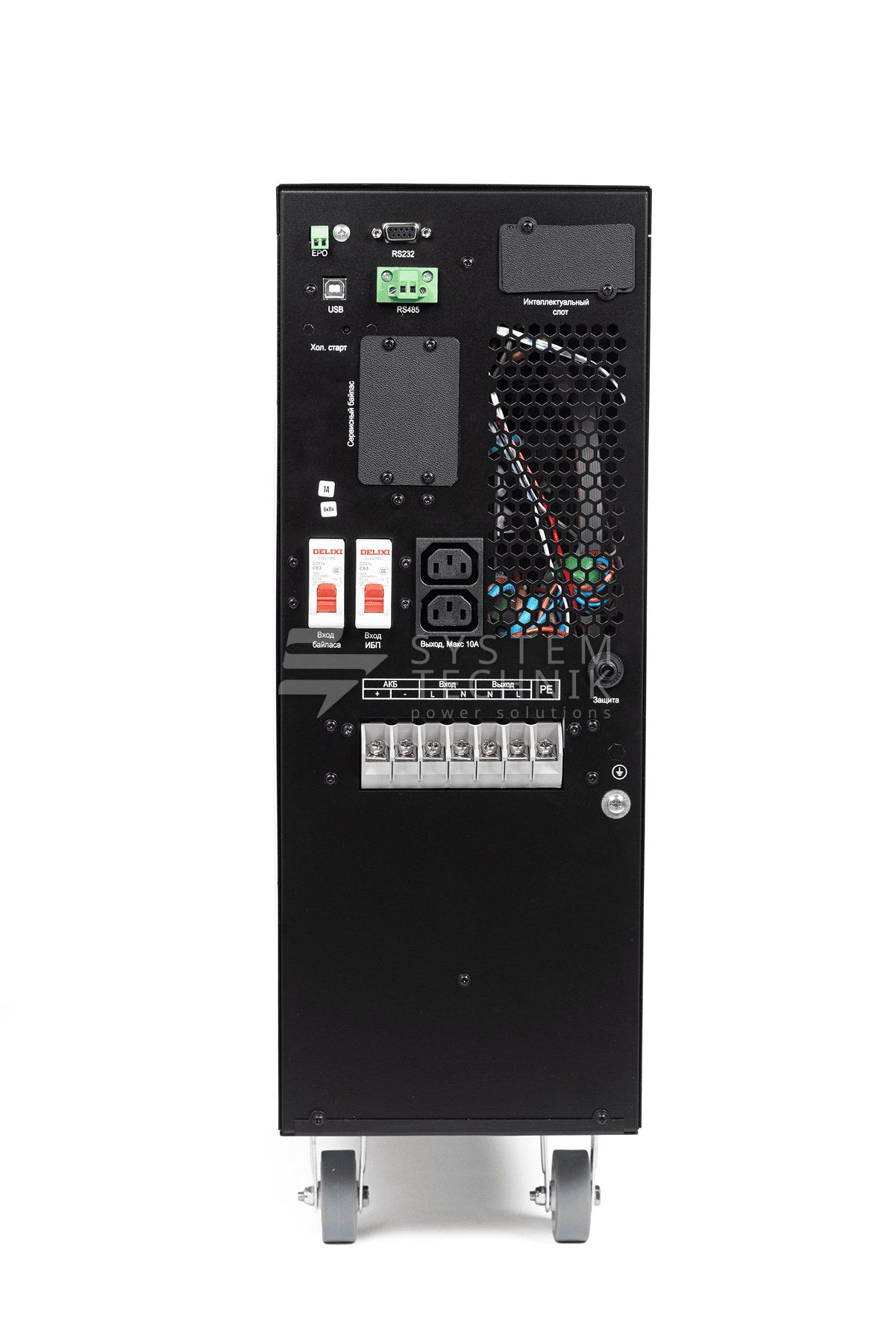 | Тип выходных разъемов питания | USB, RS232, EPO, RS485 (опционально) Смарт-слот (для опциональной установки SNMP/Сухих контактов), карта параллельной работы (опционально) |